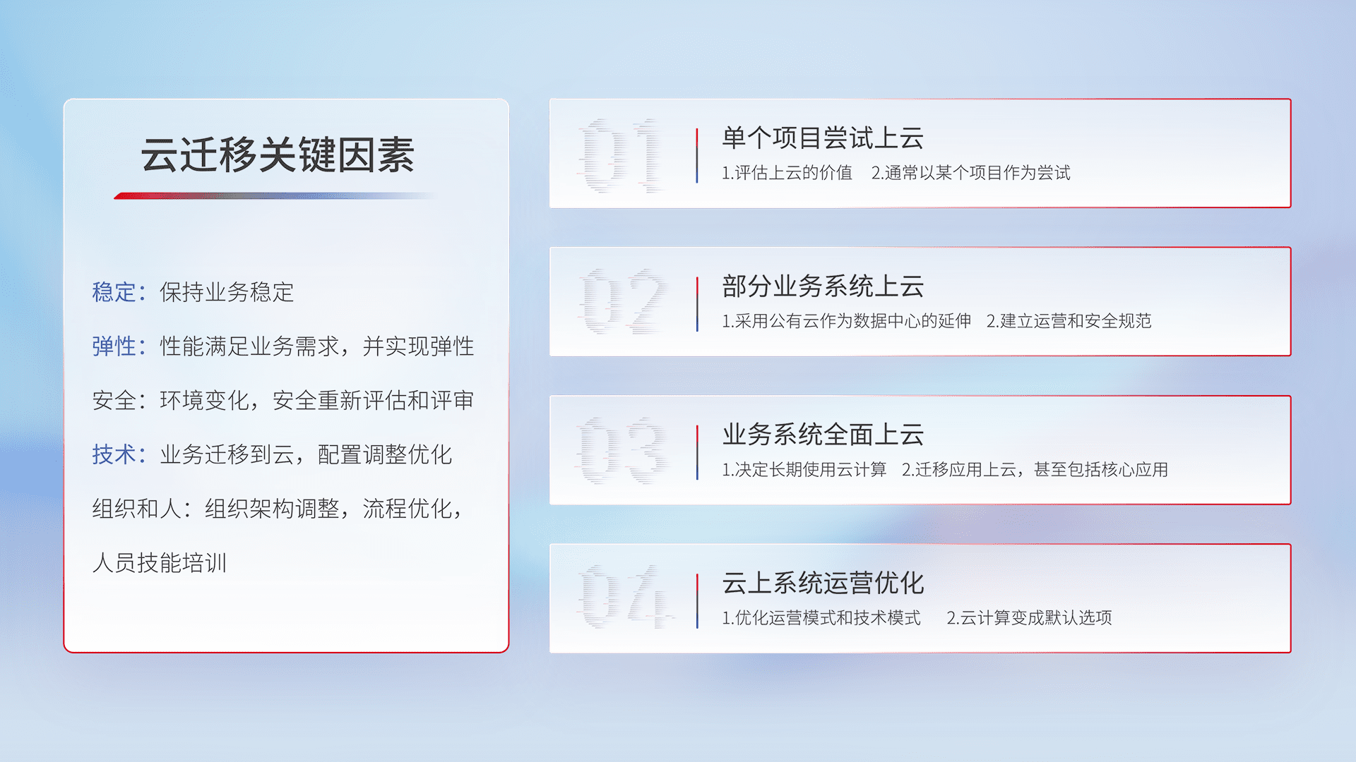 结合实际业务,,从规划设计、、、云平台选型、、、、云原生改造、、、数据迁移、、、集成交付,,,迁移全过程为客户识别最佳上云路径,,,,做好风险识别管理,,,设计网络架构、、、、身份权限、、、安全审计合规、、、操作审计、、日志审计、、监控告警策略、、、、多站点容灾设计等,,,,对云上基础设施进行整体规划,,提升IT治理水平,,以满足弹性、、、、高可用、、、高性能的需求。。